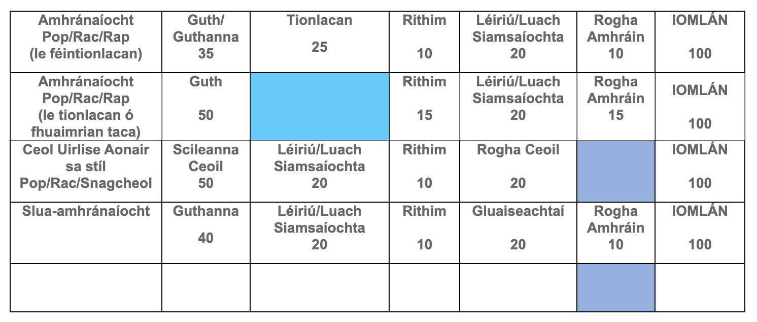 Tógfaidh na moltóirí san áireamh an luach siamsaíochta a bhaineann le gach mír agus iad i mbun oibre. Mar threoir dóibh féin agus do na hiomaitheoirí, áfach, beidh an córas marcála thíos in úsáid acu. Ní chuirfear marcanna na moltóirí ar fáil d’aon duine.